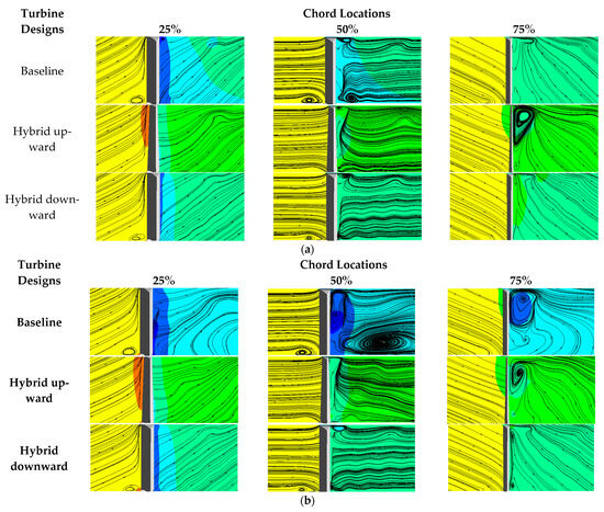 For the baseline turbine, at a flow coefficient of , the suction side pressure has decreased further, and an additional small low-pressure region appears at a 25% chord near the tip downstream of the turbine blade. The baseline turbine and the hybrid upward turbine have reached deep stall conditions. Similarly, in the streamline patterns for the flow coefficient , the baseline has multiple clockwise vortices covering the entire span. For the hybrid upward turbine, vortex shedding is shown at 50% chord, covering the whole span with separated flow regions. For the hybrid downward turbine, the most prominent low-pressure areas have covered the blade from the hub to 50% and 25% span. At the 50% chord location, a strong clockwise vortex at the tip expands throughout the blade span, and a counterclockwise vortex near the hub causes vortex shedding, which tends to cause higher noise production, flow separation, and blade stall. Furthermore, a clockwise vortex is observed at 75% chord covering almost 70% span from the tip.