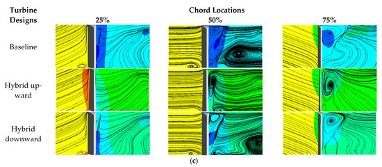 At a flow coefficient of , the low-pressure zones continue to increase, causing an adverse pressure gradient. This leads to flow separation and blade stall for the baseline turbine. As a result, multiple vortices are found and cover the entire blade span at the 50% and 75% chord locations. Similarly, the hybrid upward turbine is in post-stall. We observe flow recirculation and vortex formation at 75% chord. The hybrid downward turbine shows smooth streamlines at 25% chord, but the flow starts to detach from the surface, since multiple vortices are observed at 50% and 75%. However, the flow shows evidence of reattachment across the span.