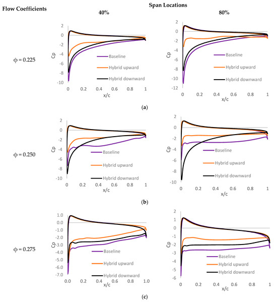 Figure 13. The low-pressure zones are expanded with increasing flow coefficients. The baseline turbine has the lowest suction pressure across the span for all of the designated chord locations. At a flow coefficient of