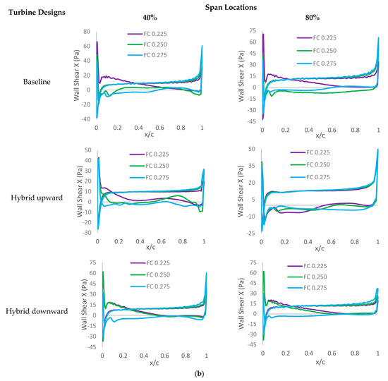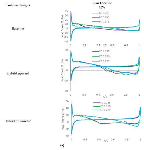 At the 40% span location, the hybrid downward design shows earlier flow separation compared to the other turbines at a flow coefficient of . Post-stall conditions for baseline and hybrid upward turbines are evident at . For instance, for the baseline, the flow detaches near the LE and reattaches at until . This is also consistent for the hybrid upward turbine where flow detaches, reattaches, and again separates near the TE. However, the wall shear curve for is very similar to what we observed at . At this flow coefficient, the hybrid downward turbine shows the start of blade stall. Finally, at , there is massive separation for all turbine configurations, reite rating blade stall.