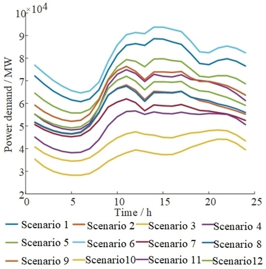 In addition, load and renewable energy typical scenario curves are shown in Figure 2, Figure 3 and Figure 4. Typical scenarios are obtained by clustering the annual data of the province. The corresponding probability of typical scenarios is shown in Table 2, using stochastic planning methods to characterise the long-term uncertainty of renewable energy output [28]. For the type of ESS planned in this paper, the most widely used lithium iron phosphate ESS in the power system is selected (the ESS price parameters are consistent with reference [29], and the variation of the ESS price with the year is referred to in reference [30]). The maximum discharge duration is set to 2 h [27]. According to the actual research and analysis, the DR peaking price is set to 625 CHY/MWh, and the valley-filling price is set to 320 CHY/MWh (the impact of price factors on ESS planning will be further explored in Section 5.3). It is assumed that the maximum adjustment ratios of peaking and valley filling are the same.