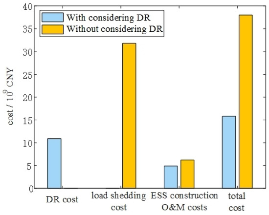 In terms of cost, there is no renewable energy curtailment cost regardless of whether or not DR is considered. A comparison of load shedding cost, DR cost, ESS cost, and total system cost in consecutive time is shown in Figure 5: