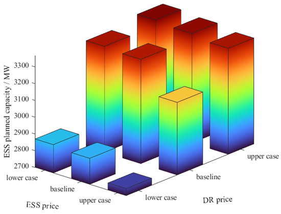 In this subsection, nine cases are conducted for consecutive year-by-year planning of ESS by combining the baseline values, upper and lower cases of ESS price forecasts with the baseline values, and upper and lower cases of DR prices, respectively. The total capacity of consecutive year-by-year planning of ESS under different price combinations is shown in Figure 6: