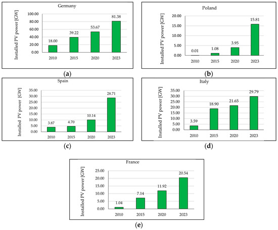 Figure 1a–e show the total installed PV power during the past 13 years in chosen EU countries. For further analysis, only the four leading countries were chosen: those with the highest (Italy and Spain) and lowest (Germany and Poland) values of solar irradiation. However, while France has average values similar to Poland regarding the cumulative power installed.