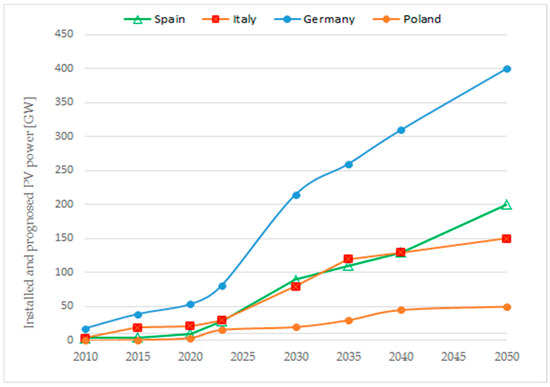 It is expected that global renewable electricity, including solar PV, will grow to 7300 GW by 2028 [2]. Among the four largest countries with the highest total installed PV power in 2023, totaling 31.7 GW, are Germany, Spain, Italy, and Poland [61].