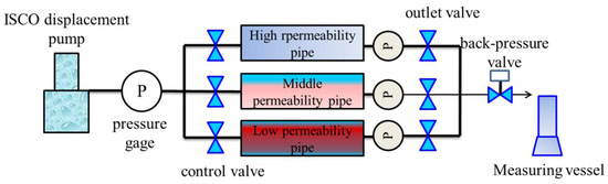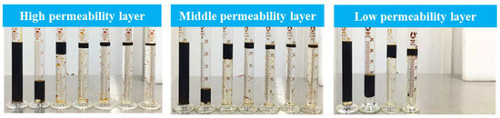 - Three sand-filled pipe models were connected in parallel and water flooding was carried out. A fixed flow rate of 3 mL/min was maintained for displacement until the water content at the outlet of the high-permeability layer reached more than 98%. Liquid production and oil production at the outlet of each sand-filled pipe were collected and recorded, and the contribution rate of liquid production at the low-permeability layer was calculated.