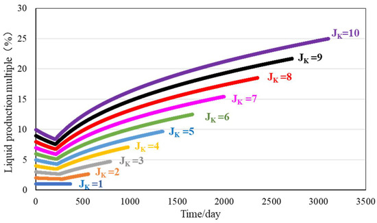As shown in Figure 4, the multiples of high- and low-permeability layers increase with the increase in the permeability difference between layers and also increase with the passage of time. As shown in Figure 5, when the step difference increases, the contribution rate of the daily yield of the low-permeability layer decreases, while that of the high-permeability layer decreases with time after water is seen.