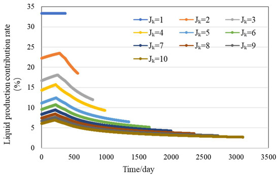 The above model parameters and permeability data under different levels of poor conditions were substituted for an iterative solution, and the relationship between the contribution rate of daily production of the low-permeability layer and the multiple of daily liquid production of high- and low-permeability layers and water flooding time was calculated, as shown in Figure 4 below. The calculation result of the yield contribution rate of the low-permeability layer when the water content of the high-permeability layer reaches 98% is shown in Figure 5.