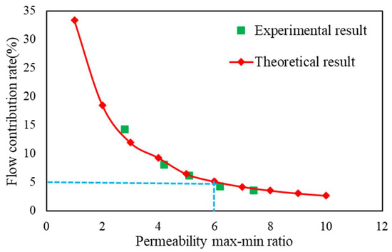The similarity between the theoretical and experimental data calculation results confirms each other’s dependability. As illustrated in Figure 7, there is a certain linear relationship between the flow ratio of the high- and low-permeability layers and the grade difference when the water content of the high-permeability layer surpasses 98 percent. As multilayer combined mining develops, the grade difference causes the low-permeability layer’s flow rate to continuously decrease, which lowers the low-permeability layer’s utilization degree relative to the high-permeability layer. Simultaneously, the computation results show that the low-permeability layer’s flow ratio is greater than 4.5, and its flow contribution rate is less than 15% when the step difference is larger than three. Although there is some utility for the low-permeability layer in this situation, the flow contribution rate is minimal. The contribution rate of the low-permeability layer is less than 5%, the flow ratio of the high- and low-permeability layers is more than 12, and the low-permeability layer’s application degree is very low when the gradient difference is greater than six.