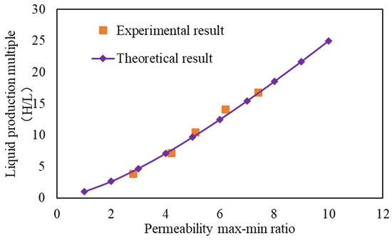 The contribution rate of the low-permeability layer flow rate or the proportion of relative water absorption when the water content of the high-permeability layer reaches 98 percent can be used to characterize the reservoir displacement effect for multilayer commingled oil production reservoirs. Thus, the multiple relation of low-permeability layer flow rate (high-permeability layer water content: 98 percent) and the percentage of low-permeability layer flow rate obtained by the theoretical calculation and experiment were compared in accordance with the data results obtained by the above two methods. Figure 6 and Figure 7 present the comparison.