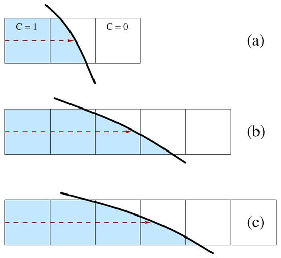 A way to consider this issue is to use the generalized height function (GHF) with an adaptive 1D stencil. In the present study, the maximum extension of the stencil is limited to 5 cells. In Figure 1, the height can be computed in the first two cases but not in the third one, where a stencil with at least 6 cells is required. However, in the last case, the height can probably be computed along the other coordinate direction. The HF value is stored as an offset from the center of the cell that contains it. An integer flag is set to indicate that the cell contains the HF and its orientation. A different value of the integer flag is used to indicate that a cell does not contain the HF value but that it was involved in the summation, as in the case of Figure 1b, where there are three cut cells, but only one contains the HF value. In isolated cut cells or with very complex local topologies, the midpoint of the Parker–Youngs reconstruction is considered [21]. Once the HF data have been computed, another sweep across the computational domain is required to collect triplets of HF values to compute and the local curvature and to interpolate these geometric properties of the interface in the cut cells where the HF is not present.