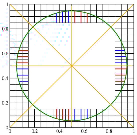 The curvature of an interface should be invariant under a few geometric transformations of the computational grid and the related volume fraction distribution. These transformations include reflections over a coordinate axis or the diagonal lines . A rotation of an angle that is a multiple of can be viewed as a sequence of such reflections. In Figure 2, a triplet of HF values of a given color, either red or blue, is clearly invariant with such a rotation. In particular, the symmetry axes are shown as yellow straight lines in that image. The set of red HF values is identical when considering a rotation of 90°. The same is true for the set of blue HF values. Furthermore, red HF values can be mapped onto the blue ones, and vice versa, with a reflection over the appropriate yellow line. The whole circumference can be reduced to an arc of 45° when considering all the rotations and reflections mentioned above.
