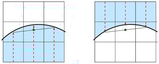 Each HF point position is stored as an offset for the cell center. When the heights are collected to compute the geometric interface properties, these points are translated to the same local coordinate system. With three consecutive heights aligned along the same direction and the notation of Equations (8) and (9), the coordinates of the three HF points are , and . Lengths are then normalized to the grid spacing h with the origin of the local coordinate system placed on top of the central HF. The updated values of the coordinates of the three points are finally , and , with and . It is clear that the geometry of the HF triplet is fully described by the two independent parameters and . At low resolutions or with very complex topologies, it will be necessary to consider both vertical and horizontal height functions or even the midpoint of the Parker–Youngs reconstruction. In that case, the points coordinate after normalization are , and , and the number of independent parameters increases to 4.