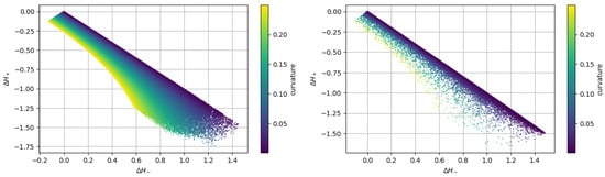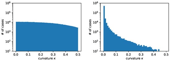 Figure 5 shows the distribution of the training dataset as a function of these two values and . The map on the left is obtained by using the uniform-in-curvature approach, while the one on the right considers the uniform-in-radius approach. It is clear that the second method heavily concentrates the values near the diagonal line where the curvature is smaller and dilutes them away from that line where the curvature is higher. On the contrary, the first approach provides a more uniform distribution of the pairs of values (, ).