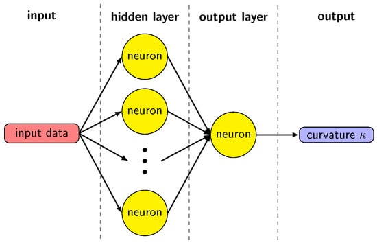 The machine learning model for the curvature evaluation is based on a two-layer feed-forward neural network with N neurons in the hidden layer and a single neuron in the output layer, as shown in Figure 6. This structure of the network is effective when mapping a continuous set onto another [25], which is the one we obtain starting from the set of volume fractions or height functions, and compute a curvature value. A single output value justifies a single neuron in the output layer. The neurons in the hidden layer have an activation function based on the hyperbolic tangent, given the non-linear relation between volume fractions or height functions and the curvature. We have tested the network with a different number of neurons in the hidden layers, with 25, 50, 75, 100, 125. Figure 7 shows the behavior of the mean square error as a function of . The MSE decreases significantly for the lowest values of , but it saturates when is greater than 75. With a smaller number of neurons, the network cannot suitably reproduce the sets of values in the dataset. On the other hand, using a large set does not give any appreciable gain, while significantly extending the computational time required to train the model. Therefore, we choose the value to compare the results with the literature [19].