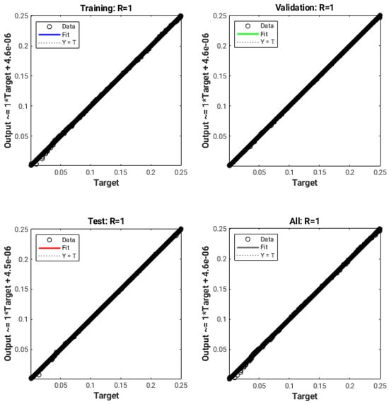 The data fitting was performed using Matlab with its built-in Neural Network Toolbox, as previously described. The training process ends when the MSE value of Equation (12) does not improve for 6 consecutive epochs or the total epoch count reaches 1000. Figure 8 shows the results obtained with the uniform-in-curvature training dataset. The evaluation involves the comparison of the output, which consists of the curvatures predicted by the neural network, with the target values representing the exact curvatures. For each data subset (training, validation, and testing) and for the entire dataset, a regression line and the correlation coefficient R have been calculated. It can be noticed in Figure 8, that the coefficient R is basically equal to 1, and therefore, the theoretical lines (in color in the various graphs) are completely covered by the dataset points. The error in absolute value between the numerical curvatures and the corresponding target values is always less than for all the entries in the dataset. This indicates a very good accuracy and a successful fit between the computed and the actual values of the curvature.