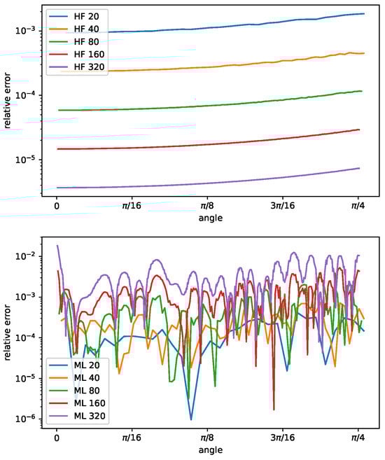 Curvature relative error as a function of the angle , , for circles with ratio equal to , for the height function method (top) and the machine learning model (bottom).