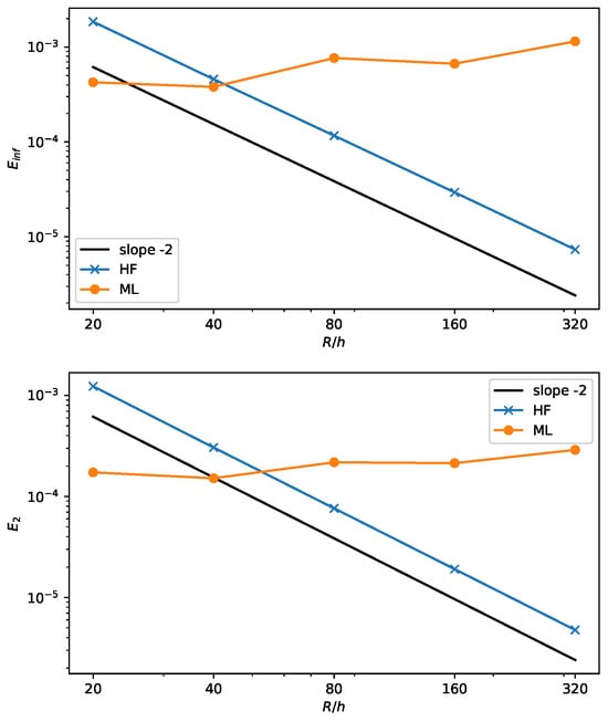 As expected, the height function method scales quadratically, as demonstrated in [8]. On the other hand, the machine learning results reflect the lack of convergence, see also Figure 9, with an almost flat value of the error that does not change with h. Nevertheless, the error is rather small. A similar behavior is also found in [9,20] for different geometrical configurations of the interface.