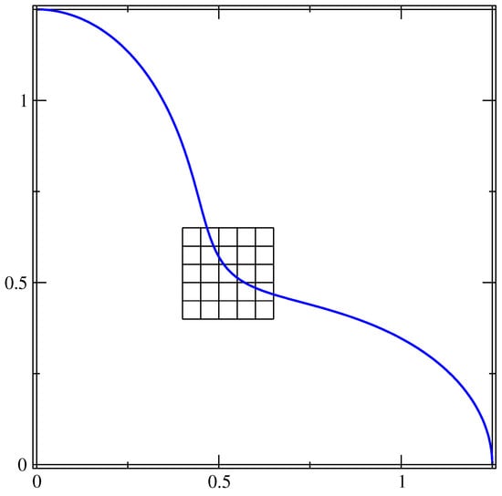 Interface line of the four-petaled star in the upper-right quadrant. The full line can be obtained with two consecutive reflections over the coordinate axes. A small portion of the grid at the lowest resolution is also shown.