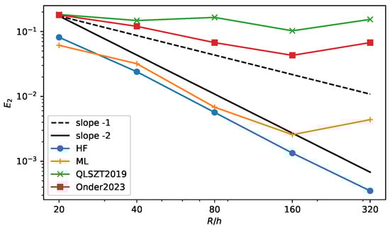 where is the numerical value and the reference curvature. The results are shown in Figure 10 for a circle with a fixed radius and variable grid spacing h. The line with a constant slope equal to is also depicted.