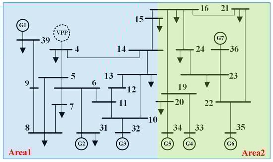 To verify the effectiveness of the proposed VPP-based secondary frequency control strategy, a simulation study was conducted within a two-area LFC system (see Figure 2). The parameters are listed in Table 1 [20,22].
