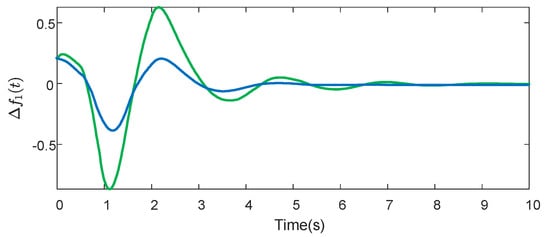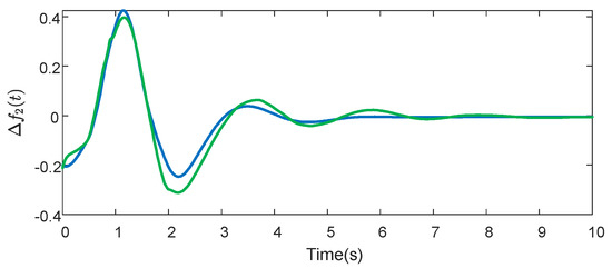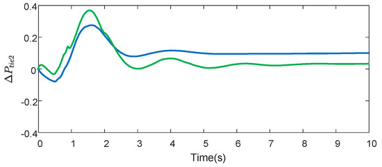 Figure 5 shows the response of , where the inclusion of a VPP (blue) results in a peak at 1.5 s and a subsequent quick decline to stability at about 5 s. The waveform without a VPP (green) displays a slower response with larger oscillations, emphasizing the VPP’s ability to provide quicker stabilization and a reduced oscillation amplitude, which is crucial in maintaining system stability amidst tie-line power perturbations.