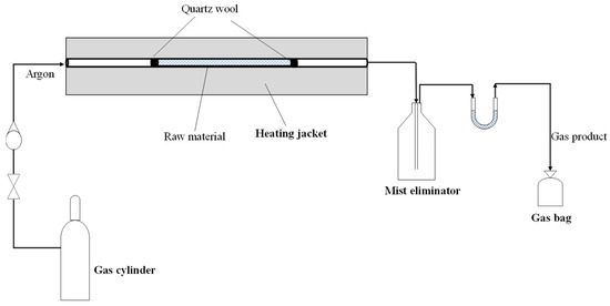 The scaled-up experiments were carried out in a horizontal tubular reactor (Figure 1) using 4.0 g of raw material at a temperature of 500 and 900 °C and also repeated three times. During the experiments, an argon flow of 20 mL/min was used to maintain an inert atmosphere, and the heating rate was 25 °C/min. The reaction time was 30 min after the pre-heating period. As Figure 1 shows, the reaction system was also equipped with a mist eliminator and a silica gel-filled tube to condense the vapors leaving the reactor and remove the moisture from the produced gas. The gas product was collected in a gas bag, and product yields were estimated by a simple mass balance difference.