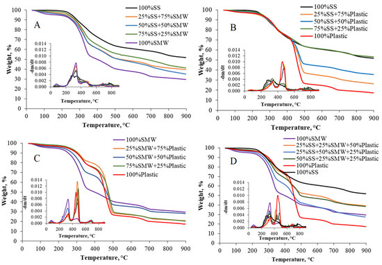 The main aim of the TG experiments was to investigate the thermal behavior of individual raw materials and their mixtures. As Figure 2A–D show, SS, SMW, Plastic and their mixtures had different decomposition behavior, which was attributed to the different compositions and the complex degradation processes. The decomposition of SS took place in three steps. In the first step (up to 200 °C), dehydration and decomposition of the bonded hydrated compounds took place, as also pointed out by Kan et al. [37]. The main decomposition and thus the major mass loss (~38%) were observed between 200 and 600 °C. In temperature range of 200–400 °C, the biodegradable compounds (e.g., polysaccharides) were decomposed, and between 400 and 600 °C, the higher molecular weight, less reactive compounds (e.g., carbohydrates) were degraded. The last decomposition step started above 600 °C and was mainly due to the decomposition of inorganic compounds. It was accompanied by a mass loss rate of 10%, and the final residue of SS was approximately 52%. Similar to SS, the main decomposition reactions took also place in the temperature range of 200–600 °C in case of Plastic and SMW. The decomposition of SMW (containing mainly paper and textile) took also place up to 600 °C with weight loss of 56%, and the complex reactions resulted in ~30% of the final residue. In the case of Plastic, strong degradation and approximately 50% of weight loss was observed between 400 and 600 °C. As it was highlighted before, the Plastic composed 59.2% of PP, 29.6% of PVC, 5.3% of HDPE, 3.0% of PET and 3.0% of PUR. According to the main structure and side groups, polymers have different behaviors in thermo- or thermochemical degradation processes. For example, the degradation of PVC and PUR took place in a temperature range of 300–400 °C. Regarding the degradation temperature of PP, it can be said that the decomposition generally starts at 350 °C and completes at 450–500 °C. In case of HDPE, a slightly higher initial decomposition temperature (~450 °C) is required, and to decompose the PS and the PET, 450–500 and 350–550 °C is necessary [38,39]. As a result, the weight loss in the temperature range of 200–400 °C (~23%) can be attributed to the decomposition of the PVC, PUR, and the first degradation step of PP. The definite peak between 400 and 600 °C was the result of the degradation of the PP, HDPE, PS and the PET.
