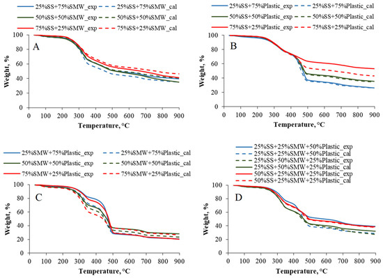 Experimental and calculated TG curves of the blends ((A): SS + SMW blends, (B): SS + Plastic blends, (C): SMW + Plastic blends, (D): Ternary mixtures).