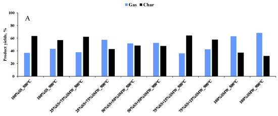 In order to justify the results of the TG analysis, the scaled-up experiments were carried out at temperatures of 500 and 900 °C. At 500 °C, 35.9–66.5% gaseous product was formed, while the gas yields were in the range of 41.2–74.6% at 900 °C (Figure 4A–D). During the scaled-up experiments, no detectable amount of liquid product was identified, which was attributed to the design and layout of the tubular reactor. As expected, gas product yields increased with the reaction temperature, and the amount of the so-called char varied along the opposite trend. These tendencies were attributed to the lower thermal stability of components at higher temperatures and to the higher degree of devolatilization and secondary reactions [40]. The product yields were also affected by the raw materials. As the data show, SMW and Plastic addition increased the gas yields and decreased the amount of the final residues. The reason for this is the higher carbon and hydrogen content of the mentioned raw materials as well as the higher heating value, which results in different thermal decomposition profiles compared to sewage sludge [41]. In addition, the higher heat release from Plastic and SMW decomposition can provide the necessary thermal energy to drive the endothermic reactions of sewage sludge pyrolysis, improving the overall energy efficiency and increasing gas yields. SMW and Plastic addition can also improve the gas yields and accelerate the degradation reactions. In addition, the interaction between the decomposition products of SMW, Plastic and sewage sludge can lead to intermediate reactions that enhance the overall process. Other than the reasons listed, the higher gas and lower residue yields observed during the co-pyrolysis can be attributed to the higher reactivity of tertiary carbon atoms present in PP, HDPE, PVC, PUR and PET [42], while in case of SMW-containing blends, the tendency was the result of the lower thermal stability of paper and textile [43].