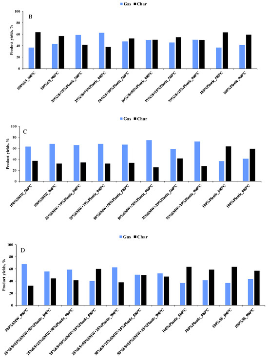 Product yields of scaled-up experiments ((A): SS + SMW blends, (B): SS + Plastic blends, (C): SMW + Plastic blends, (D): Ternary mixtures).