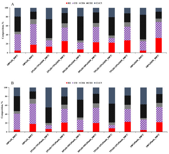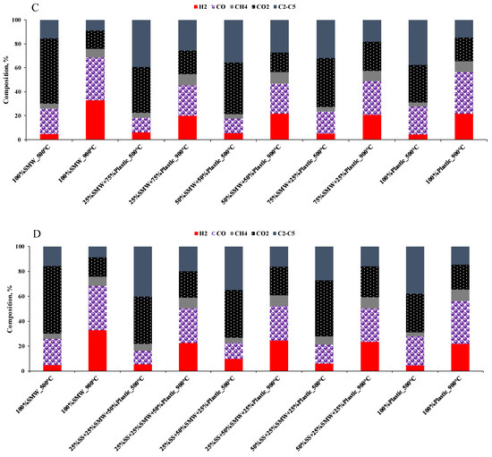 Gas composition of the scaled-up experiments ((A): SS + SMW blends, (B): SS + Plastic blends, (C): SMW + Plastic blends, (D): Ternary mixtures).