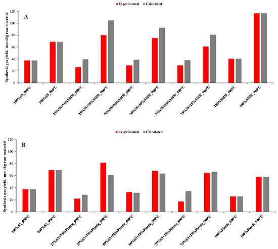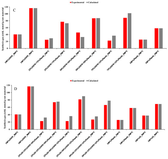 Experimental and calculated synthesis gas yields ((A): SS + SMW blends, (B): SS + Plastic blends, (C): SMW + Plastic blends, (D): Ternary mixtures).