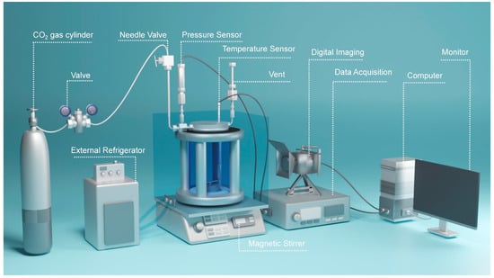 Continuous data acquisition is used to monitor pressure and temperature changes throughout the experiments. A high-resolution digital camera (model MZL-DJ630) is used to capture images of the morphology of the CO2 hydrate. A magnetic stirrer is used at the bottom of the reactor with variable stirring speeds of 600 rpm. More details can be found in our previous study [40,41].