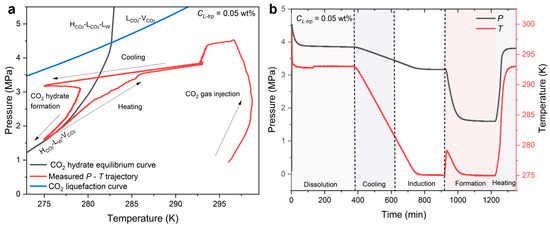 The induction time (tind) is the period between the time when measured P-T first crossed the CO2 hydrate phase equilibrium (teq) and the time when the first CO2 hydrate crystal was observed (tn). The calculation of CO2 gas uptake during CO2 hydrate formation should consider the solubility of CO2 in aqueous solution. The normalized CO2 gas uptake in the hydrate phase is calculated to better evaluate the gas storage capacity of CO2 hydrate and the kinetics of CO2 hydrate formation [42]. Figure 2 shows typical P-T trajectory and P and T evolution curves during CO2 hydrate formation and dissolution at CL-trp = 0.05 wt%. CO2 hydrate formation is under the continuous stirring condition, as described in our previous study.