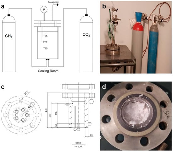 (a) Measures and technical details of the 316SS lab-scale reactor used for the production of hydrates, (b) picture of the experimental system, (c) schematization (at left) and pictures (at right) of the experimental apparatus, and (d) picture of the reactor.