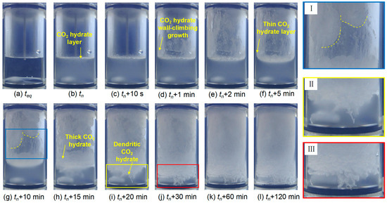 Subsequently, CO2 hydrate wall-climbing growth begins with the thin layer on the wall in the upper gas phase region within 5 min (see Figure 6d–f). Then, the plaque-like thickening of the CO2 hydrate layer forms along the wall due to the promotion of L-trp (see Figure 6g). This propagation of growth toward the center is related to the low temperature of the reactor wall and to the promotional effect of L-trp [54]. The deflection time is negligible due to the continuous stirring [49]. A large amount of snow-like CO2 hydrate formation is visible on the wall within 20 min (see Figure 6i). Similar to CO2 hydrate growth in the presence of 0.3 wt% L-leu [42], hydrate growth in downward direction is observed. In this system, hydrate shows dendritic morphology and fills almost the bulk solution (see Figure 6k), which is in line with the hydrate growth pattern promoted by hydrophobic amino acid [48,55].