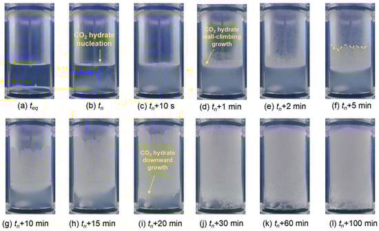 Figure 7 illustrates the CO2 hydrate formation in 0.30 wt% L-trp solution. CO2 hydrate nucleation occurs in the aqueous solution and gas–liquid interface as shown in Figure 7b. Following the nucleation event, a porous layer of solid hydrate swiftly covers the gas–liquid interface within 10 s (see Figure 7c). Subsequently, thick hydrate grows along the wall as seen in Figure 7e–i, which is different from the growth pattern in 0.10 wt% L-trp. A petal-like hydrate rim can be observed in tn + 5 min, which is similar to the CO2 hydrate growth pattern in the presence of L-leu over 1.00 wt%. With time elapsed, there is also some hydrate growth propagation downward in the direction of the aqueous phase (see Figure 7i). Finally, CO2 hydrate grows in both directions and almost fills the entire reactor (see Figure 7l). This typical growth behavior is in line with the hydrate promoted by amino acid in different concentrations [40,42].