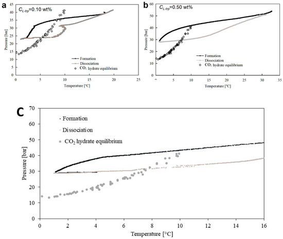 The trend observed in these experiments is well comparable with that observed in the presence of stirring (see the previous section). The similarity is more marked at 0.1 wt% L-trp. In these tests, the formation of hydrates started as soon as the system entered in the stability zone for CO2 hydrates, as clearly visible in Figure 8a, where the pressure increased its lowering trend immediately after it overcame the CO2 phase equilibrium line. However, the formation of hydrates initially remained few and pronounced, and the overall decrease in pressure was limited. That condition persisted until the system reached a certain P-T condition (which will be described in the following paragraphs); then the production of hydrates became abundant, and the pressure drastically dropped. Despite the lowering of temperature, as soon as the formation of hydrates was completed, the internal pressure marked a still different trend and continued to drop only as a function of its dependency from temperature. Figure 8b shows an example of an experiment carried out at 0.5 wt% L-trp. Similarly to that observed in Figure 8a, out from the hydrate stability zone (or to the right of the equilibrium curve), the lowering of pressure was continued and caused only by the internal change in temperature. When the system moved on the left side, or within the formation and stability zone for carbon dioxide hydrates, the pressure accelerated its decrease. Moreover, its gradient varied gradually and reached a certain parallelism with the phase equilibrium line, proving that the process proceeded in accordance with its theoretical trend, even if at conditions shifted to the stability zone. However, the formation process ended at pressures higher than those registered in tests carried out at 0.1 wt% L-trp, thus denoting a lower production of hydrates.