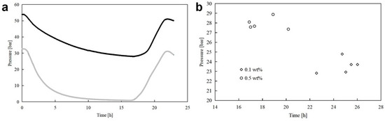 Only one diagram was reported, since the values of interest, related to the time dependency of temperature and pressure for each test, are resumed in the following Figure 9b. The proportionality between the two thermodynamic variables remained along the whole experiment, but it frequently changed in intensity as a function of the hydrate formation, dissociation, or none of them. Based on the present plot, for each test, the lowest pressure was measured, together with the time required to reach it, corresponding to the formation time.