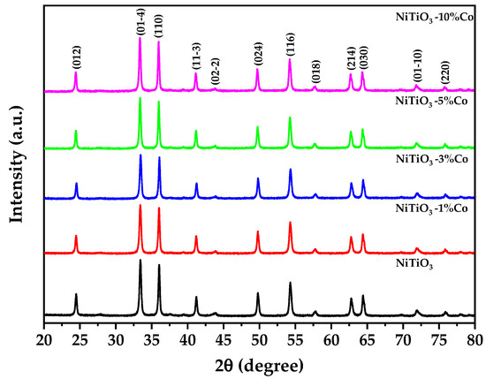 The results display that all samples exhibited diffraction patterns consistent with the prevailing hexagonal ilmenite structure of NiTiO3 (space group R-3, no. 148) [34], which is in good agreement with the 96-900-7390 COD database standard [35]. The lattice parameters showed a systematic increase with cobalt doping, with a = b and c constants expanding from 5.0276 Å and 13.8124 Å for undoped NiTiO3 to 5.0306 Å and 13.8212 Å for 10% Co-doped NiTiO3. Using Shannon’s tabulated ionic radii [36], these changes can be attributed to the substitution of larger Co2+ ions (0.745 Å) onto smaller Ni2+ sites (0.69 Å).
