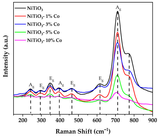The Raman analysis results clearly showed that all Raman active modes exhibit decreased intensity related to the amount of cobalt doping in the sample. The undoped nickel titanate was the least affected, while the sample with 10% doping showed the greatest intensity decrease, with the main peak diminishing to only 10.8% of the undoped intensity. This effect is primarily attributed to distortion of the crystal structure due to substitutional doping of Co ions on Ni sites and the generation of oxygen vacancies [24,40].