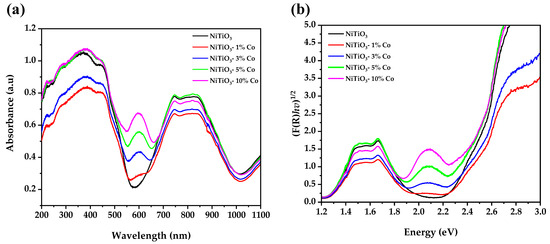 The UV-vis absorption spectra (Figure 5a) of pure and cobalt-doped NiTiO3 exhibit distinct regions related to the electronic structure. The fundamental absorption edge from 200 to 550 nm corresponds to the bandgap transition, while higher wavelength humps arise from intraband transitions associated with the d-orbital manifold [49].