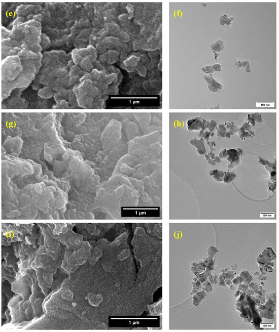 The scanning electron microscopy (SEM) images (Figure 6a,c,e,g,i) reveal that the synthesized pure and cobalt-doped NiTiO3 nanoparticles exhibit significant agglomeration, forming irregularly shaped clusters. This agglomeration can be attributed to the high surface energy of the nanoparticles [54] and their tendency to minimize the overall surface area.