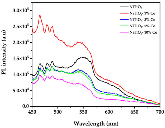 Photoluminescence spectroscopy provided further insights, revealing an initial increase in PL intensity for NiTiO3-1%Co, followed by a systematic decrease with higher cobalt concentrations. NiTiO3-10%Co showed the lowest PL intensity, suggesting effective suppression of radiative recombination at higher doping levels.
