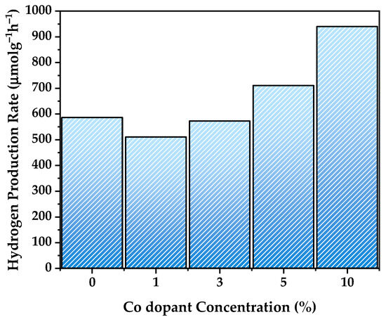 The photocatalytic hydrogen generation performance of pure NiTiO3 and cobalt-doped NiTiO3 samples was evaluated under UV light irradiation (Figure 8) to investigate the influence of cobalt doping on the photocatalytic activity. The use of UV light is particularly relevant for NiTiO3-based photocatalysts, as NiTiO3 has a wide bandgap and is primarily active in the UV region. The hydrogen evolution rates, expressed in μmol·g−1·h−1, provide valuable insights into the effectiveness of the photocatalysts under UV light irradiation.