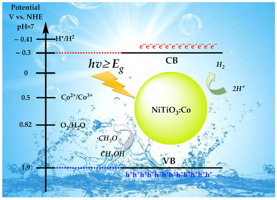Based on our experimental findings and established photocatalytic principles, we propose the following mechanism (Figure 9) for enhanced hydrogen production in Co-doped NiTiO3. Upon UV light absorption, electron–hole pairs are generated: