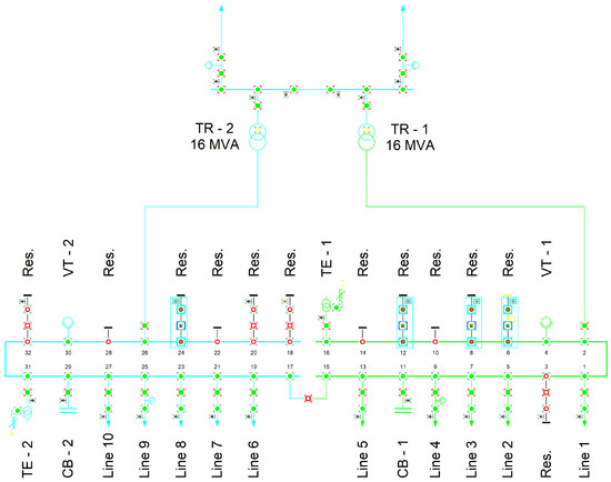 Diagram of the studied transformer station 110/15 kV, where: TR—HV/MV transformer, VT—voltage transformer, TE—grounding transformer, CB—capacitor bank, Res.—reserve switch-bay.
