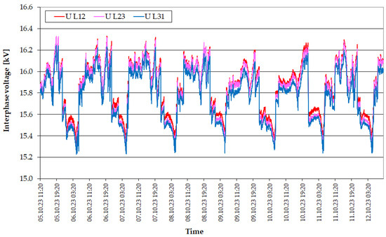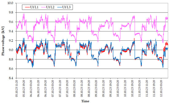 The first analyzed parameter was the voltage on the MV side. As it can be seen in Figure 2 and Figure 3, the voltage values change cyclically during the day, which is the result of the station load changes and the automatic regulator, which reduces the voltage value at night when the load is the smallest.