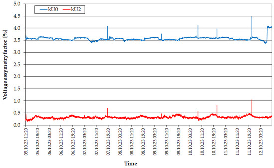 In the registered voltage curves (Figure 2) in individual phases, Phase 2, shifted in relation to the others, is clearly visible. Such a shift does not occur in the case of line-to-line voltages (Figure 3). This is reflected in the registered values of asymmetry coefficients (Figure 4). The negative asymmetry factor did not exceed 0.5% for most of the measurement time. In contrast, the zero asymmetry factor was more than seven times higher, averaging 3.49%.